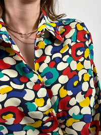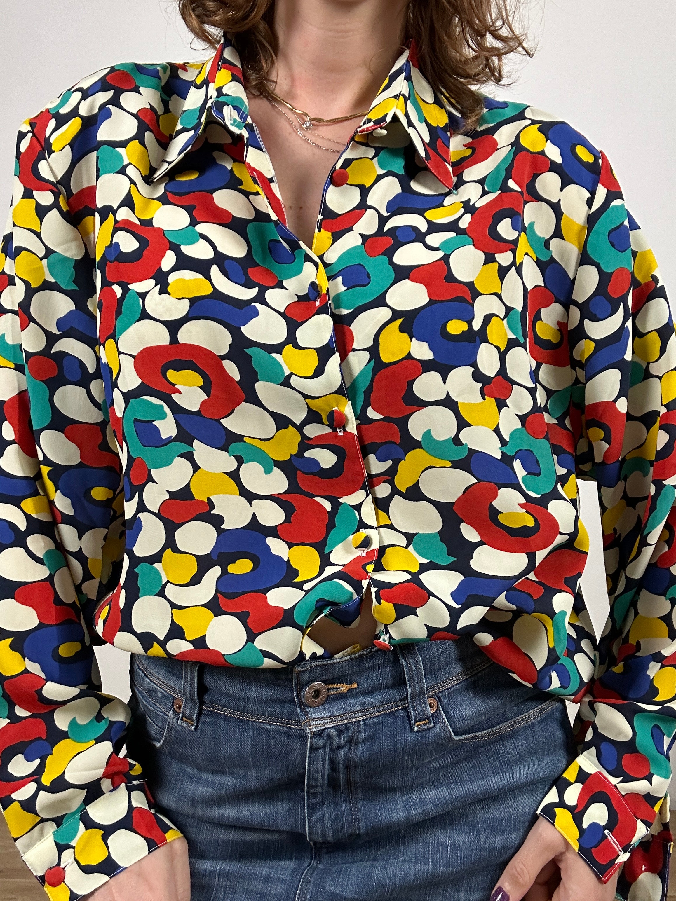 Camicetta vintage a fantasia. Composizione in poliestere con spallina, facilmente removibile perchè esterna, vestibilità over. I bottoncini sono foderati, presenza di uno spacco laterale, modello a manica lunga.