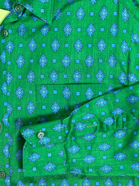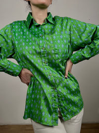 Camicia vintage color verde brillante con fantasia anni 70 e taschino sul davanti. Morbidissima al tatto composizione 100% cotone e bottoncini di scorta cuciti sull’etichetta. Vestibilità morbida.
