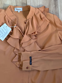 Camicetta anni 70, composizione 100% seta con rouches sul davanti e bottoncini decorati, stupendi. Rifinita a mano, quelle cose ormai introvabili. Da fondo di magazzino anni 70, con etichetta e texture extra soft. Vestibilità dritta.