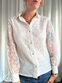 Camicetta sartoriale made in Torino. Anni 70, colletto a punta. Texture in pizzo con maniche trasparenti e bottoncini coordinati. Vestibilità dritta.