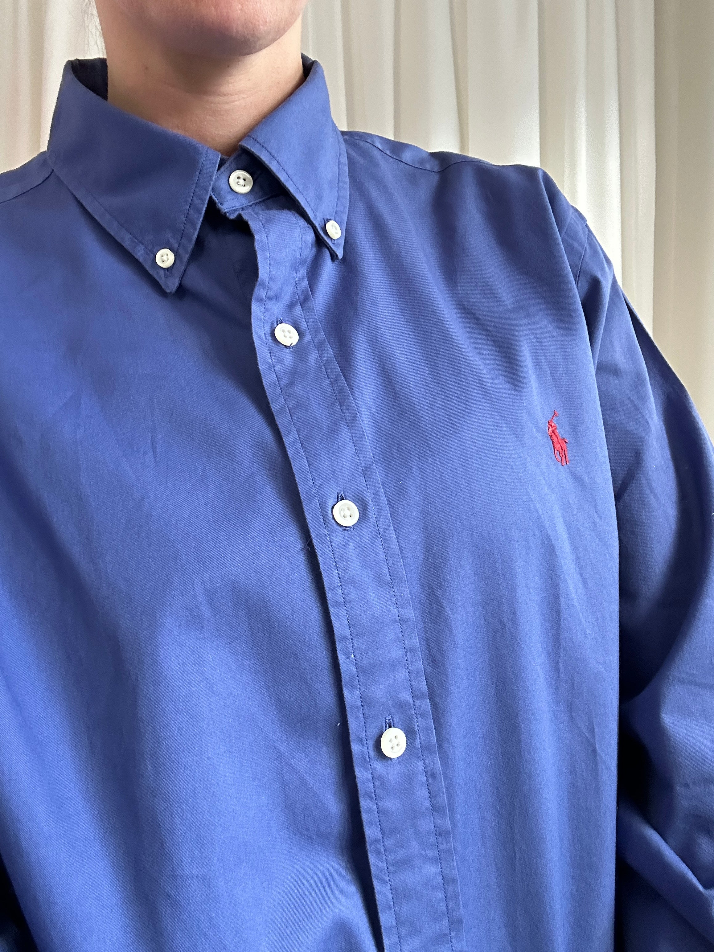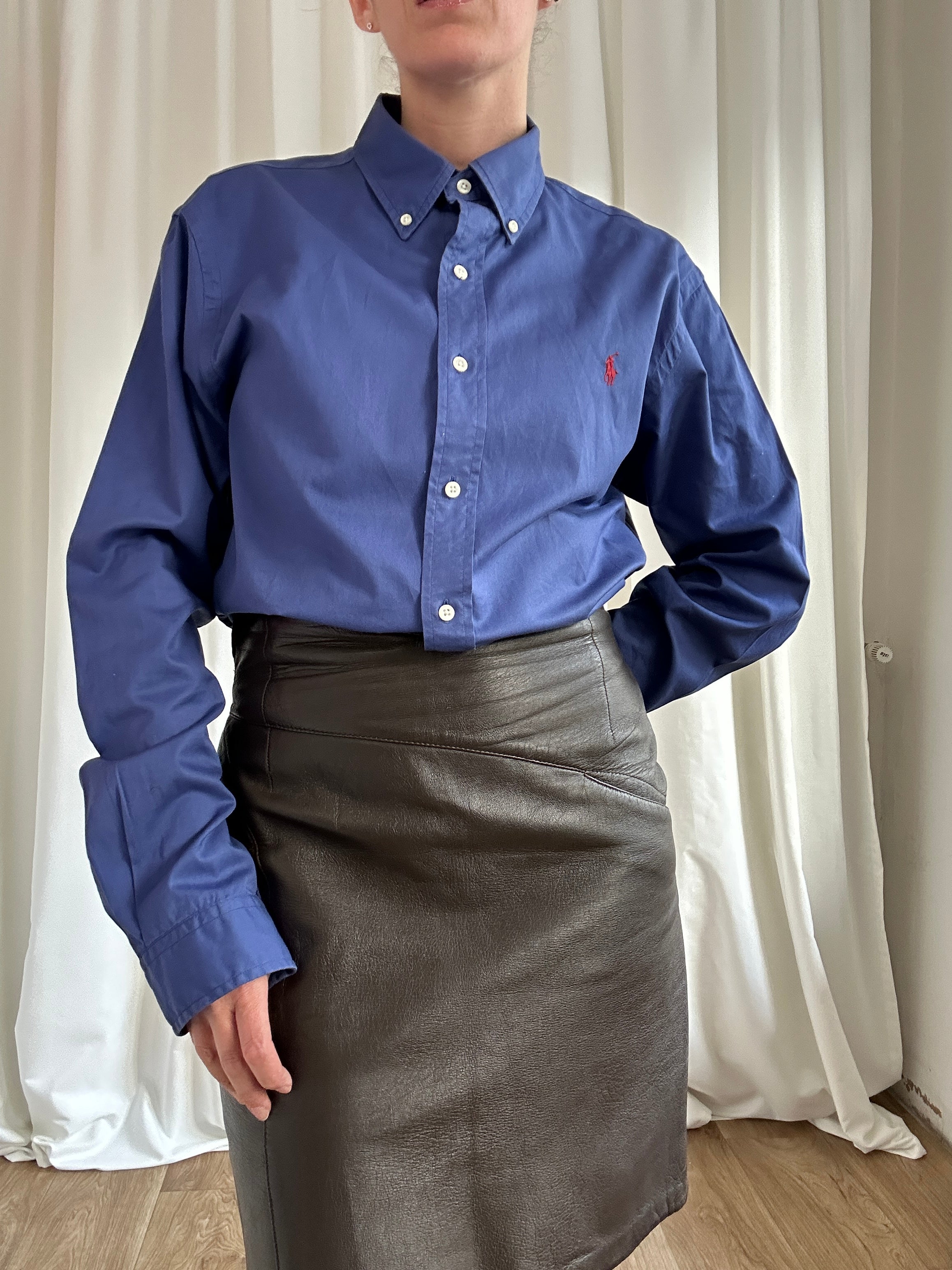 Camicia Ralph Lauren anni 2000. Taglio classico, composizione cotone. Nasce da uomo con bottone a destra, stupenda unisex, indica taglio Slim fit. Di color indaco, in cotone bellissimo e bottoni di scorta cuciti all’interno.