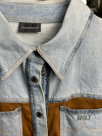 Camicia vintage Rocco Barocco con dettagli jeans con inserto in finta pelle scamosciata. Composizione jeans 100% cotone, chiusura pussuoir a manica lunga. Vestibilità leggermente sciancrata.