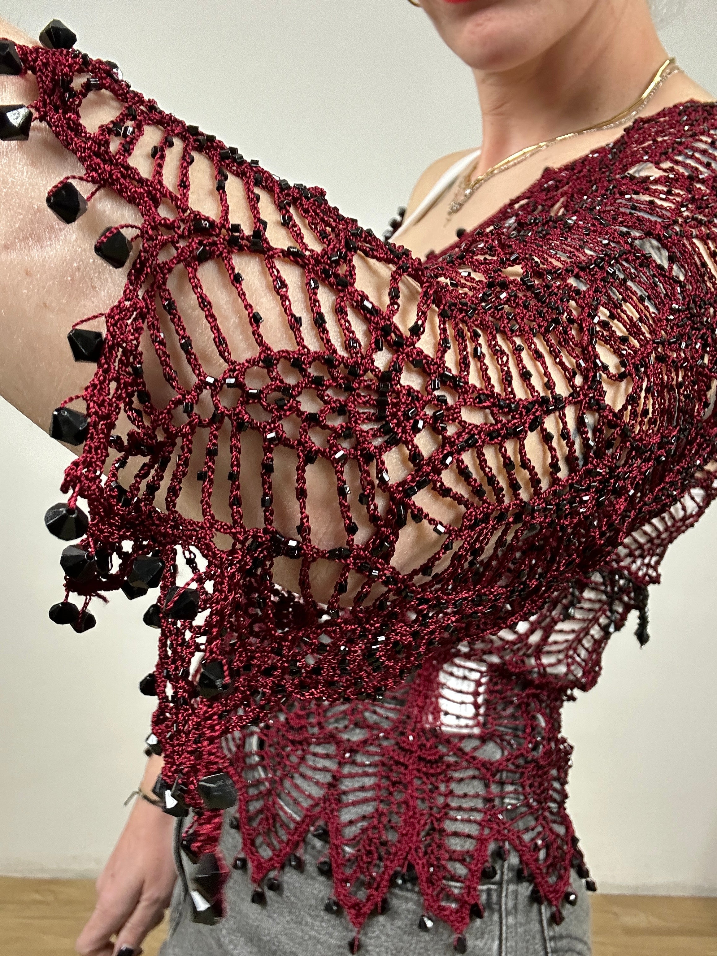 Maglia anni 2000 a manica lunga a rete. Composizionenon riportata, con micro perline ricamate sulla trama e perline nere sul fondo dal taglio asimmentrico. ed elasticizzata. Vestibilità aderente.