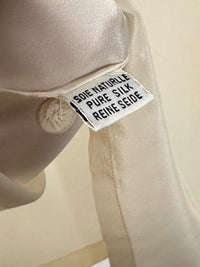Camicia vintage composizione in pura seta con ricami sul petto, sul colletto e sul bordo della manica. Al tatto morbidissima con bottone di scorta. Vestibilità morbida