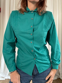Camicetta vintage anni 80. Modello con pinces sia sul petto che sulla schiena a donare un leggero volume. Composizione 100% cotone. Adorabile, color turchese e senza spallina, con bottoncini piccini. Vestibilità: lievemente sciancrata.