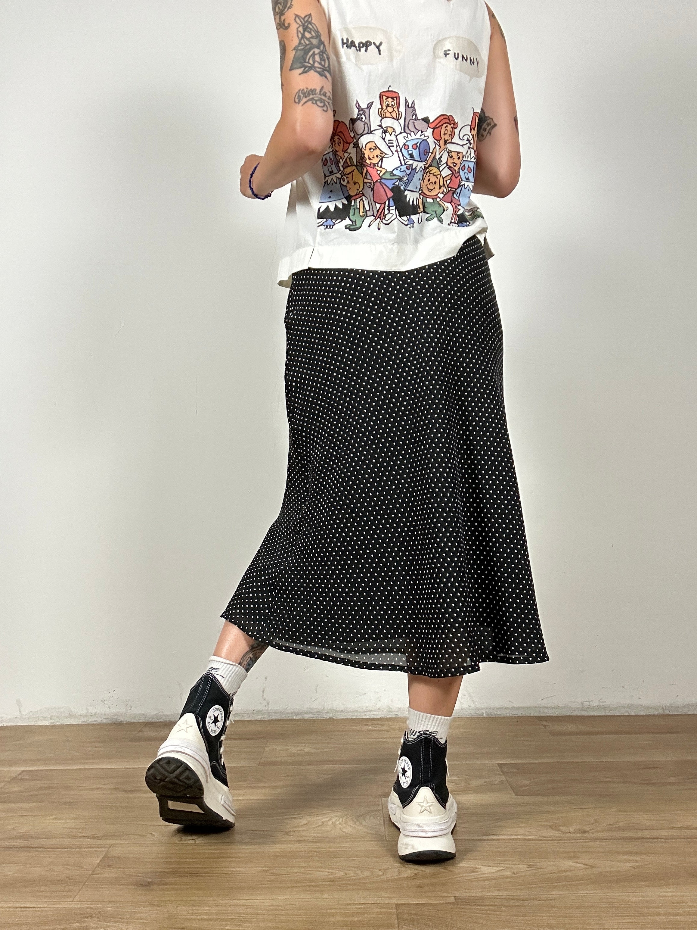 Gonna anni 2000 Stefanel. I pois sono dei piccoli rombi. Composizione in poliesterecon doppio strato con foderina interna, romantica e passe-partout.