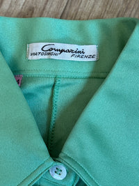 Camicetta anni 70, con colletto a punta pazzesco e bottoncini a contrasto. Color verde menta by Comparini. Composizione 100% poliestere vintage, di qualità. Colore fedele nelle prime 4 foto.