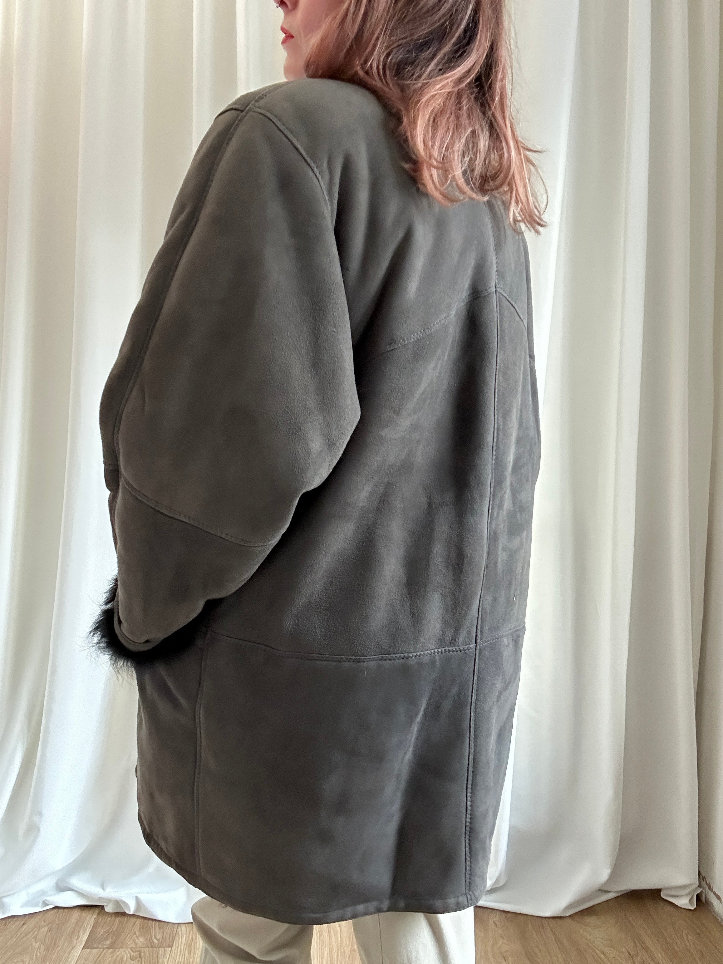 Montone Original Shearling con lana lunga e nera all'interno, pazzesco. Color grigio, meno facile da trovare, scamosciato con chiusura a bottoncini decorati. Taglio anni 80 con manica ampia, leggermente a uovo. Di una morbidezza estrema, anche l'esterno, nonostante l'età. Praticamente è come stare ai tropici, caldissimo. Vestibilità morbida, manica ampia.