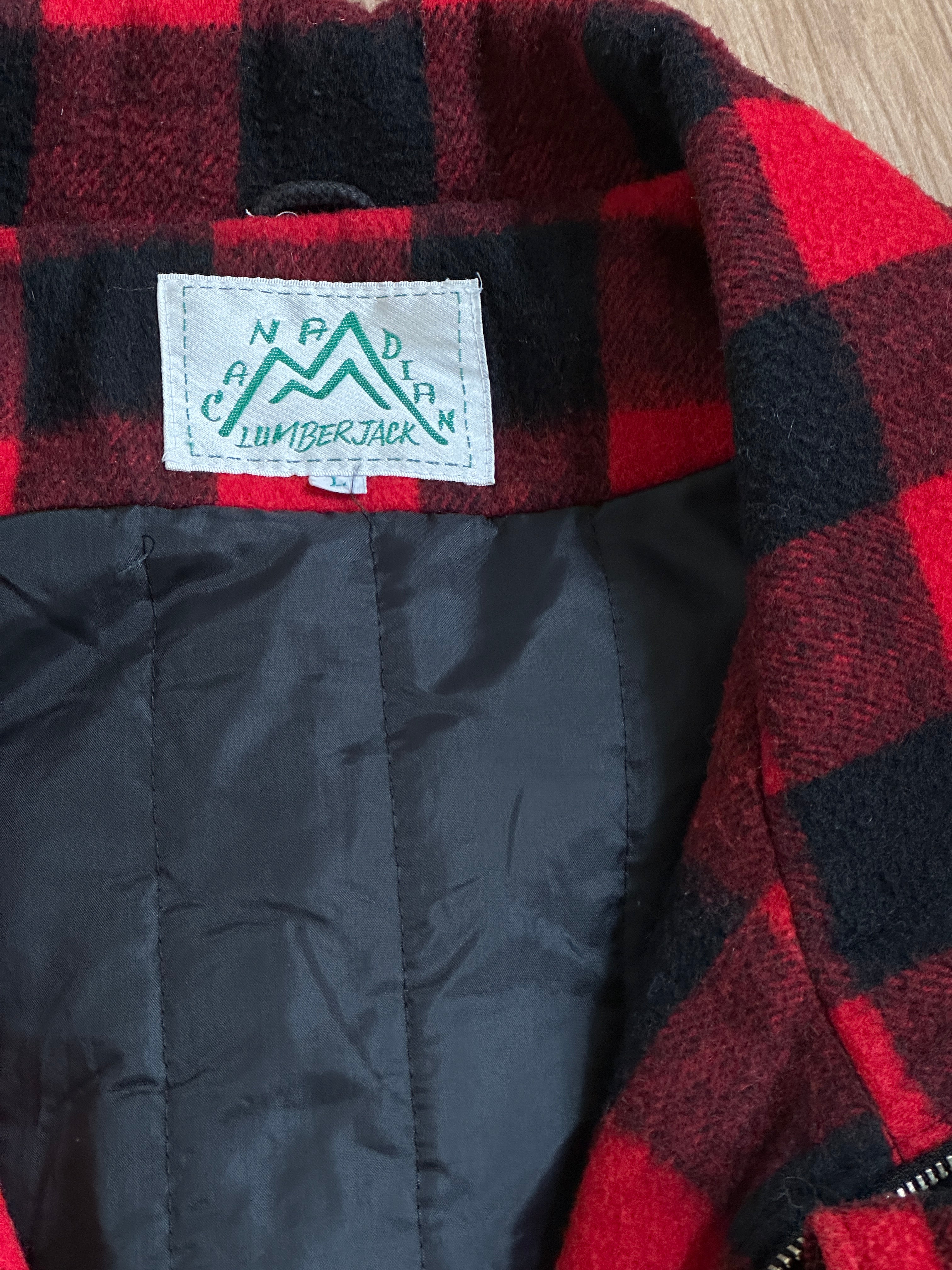 Giacca boscaiolo Canadian Lumberjack. Composizione misto lana, modello con quadrotti grossi rossi e neri. Chiusura con zip e cannolè in maglia sul fondo, leggermente imbottita, iconica. Vestibilità ampia, over.