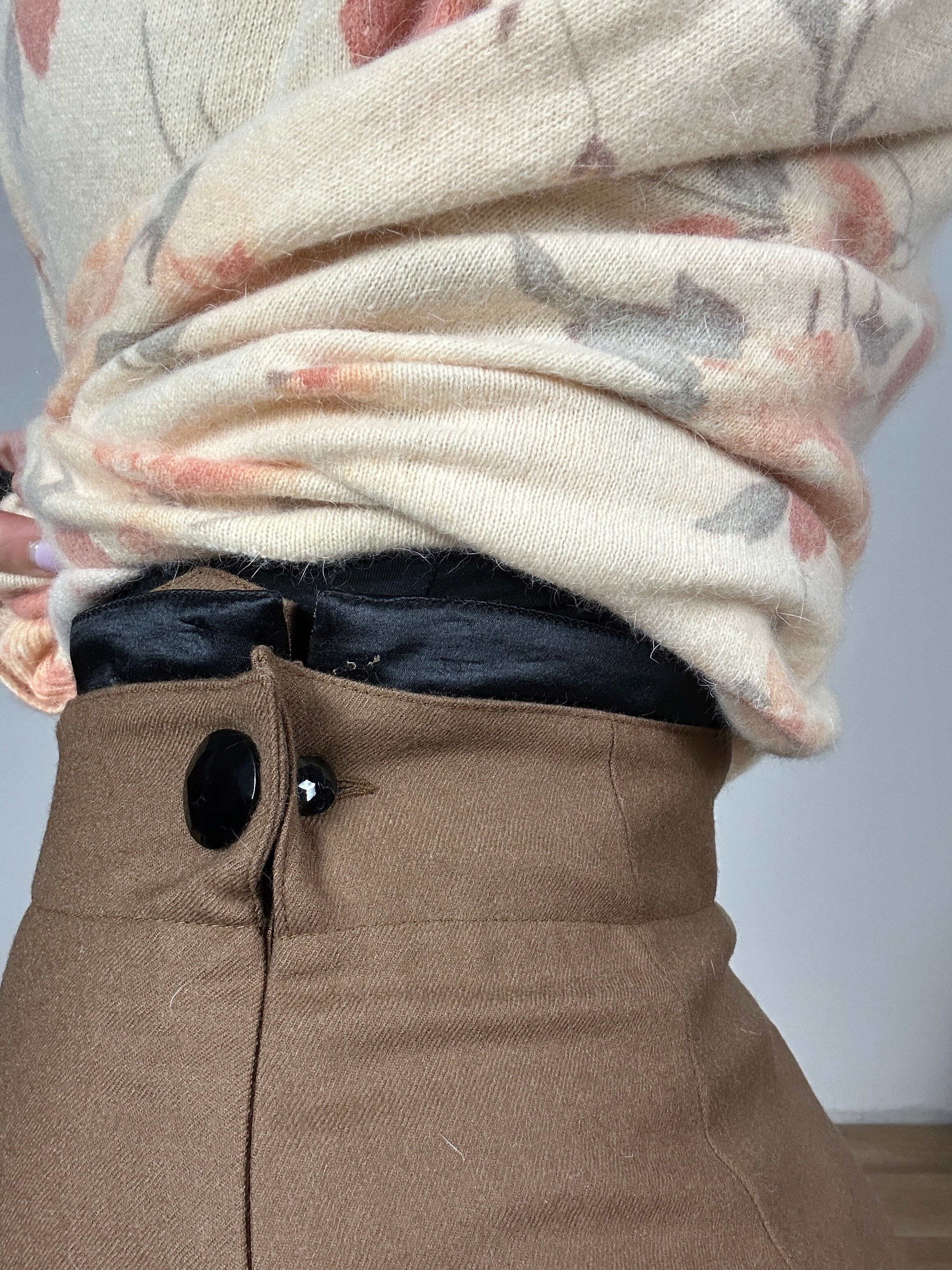 Gonna Studio Ferrè anni 80 a vita altissima. Composizione in pura lana vergine con fascia di raso a vita alta e bottone gioiello. Pazzesca ed elegante.