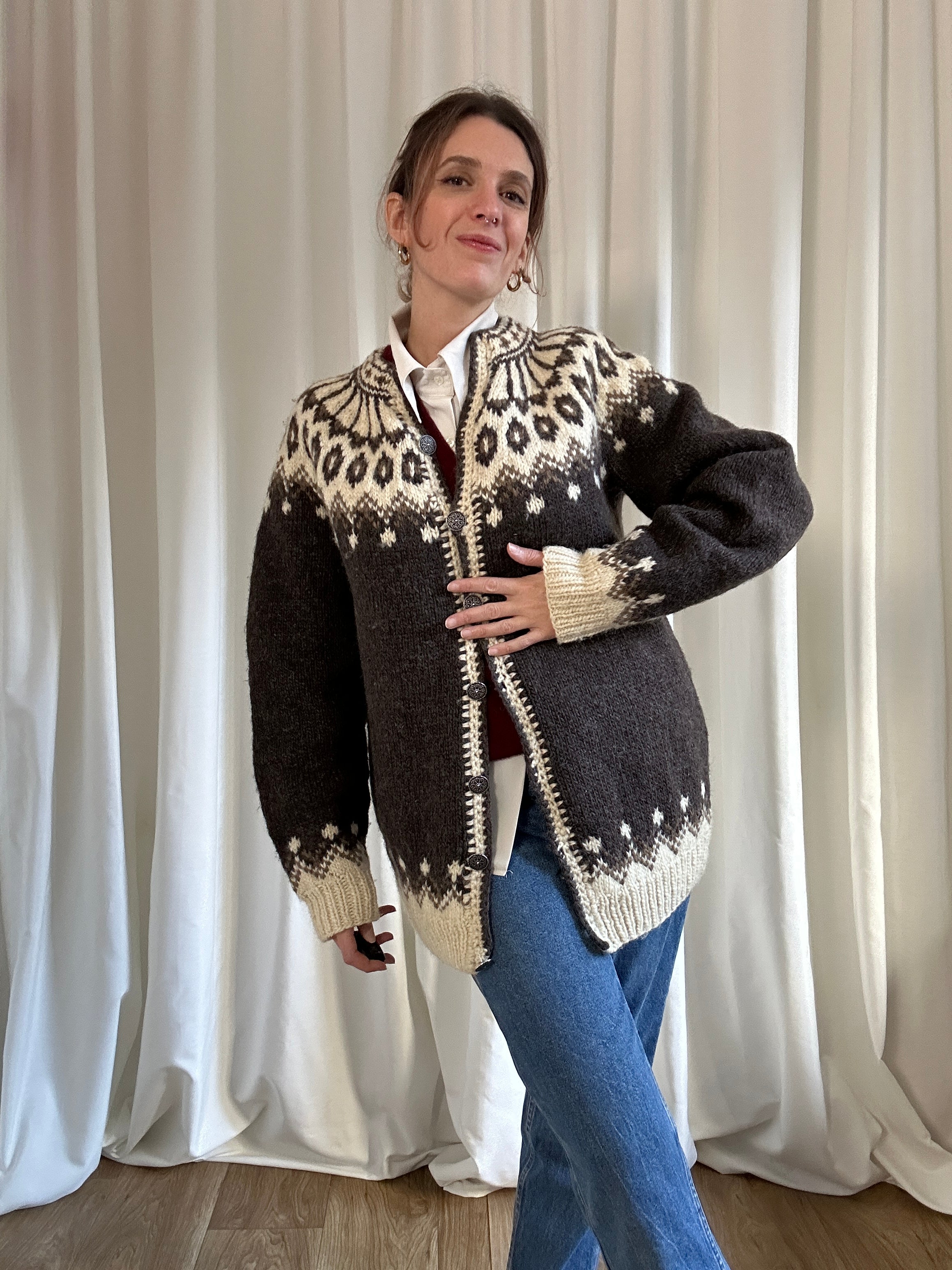 Cardigan vintage stupendo made in Denmark. Composizione 100% pura lana vergine scandinava, con spalla raglan. Di colore marrone e panna, con chiusura a bottoncini in metallo decorati. Il motovo tipico di questa tipologia di cardigan e maglioni, percorre tutta la parte alta e viene richiamato sui polsi e sul fondo. Caldo e morbido. Vestibilità: over.