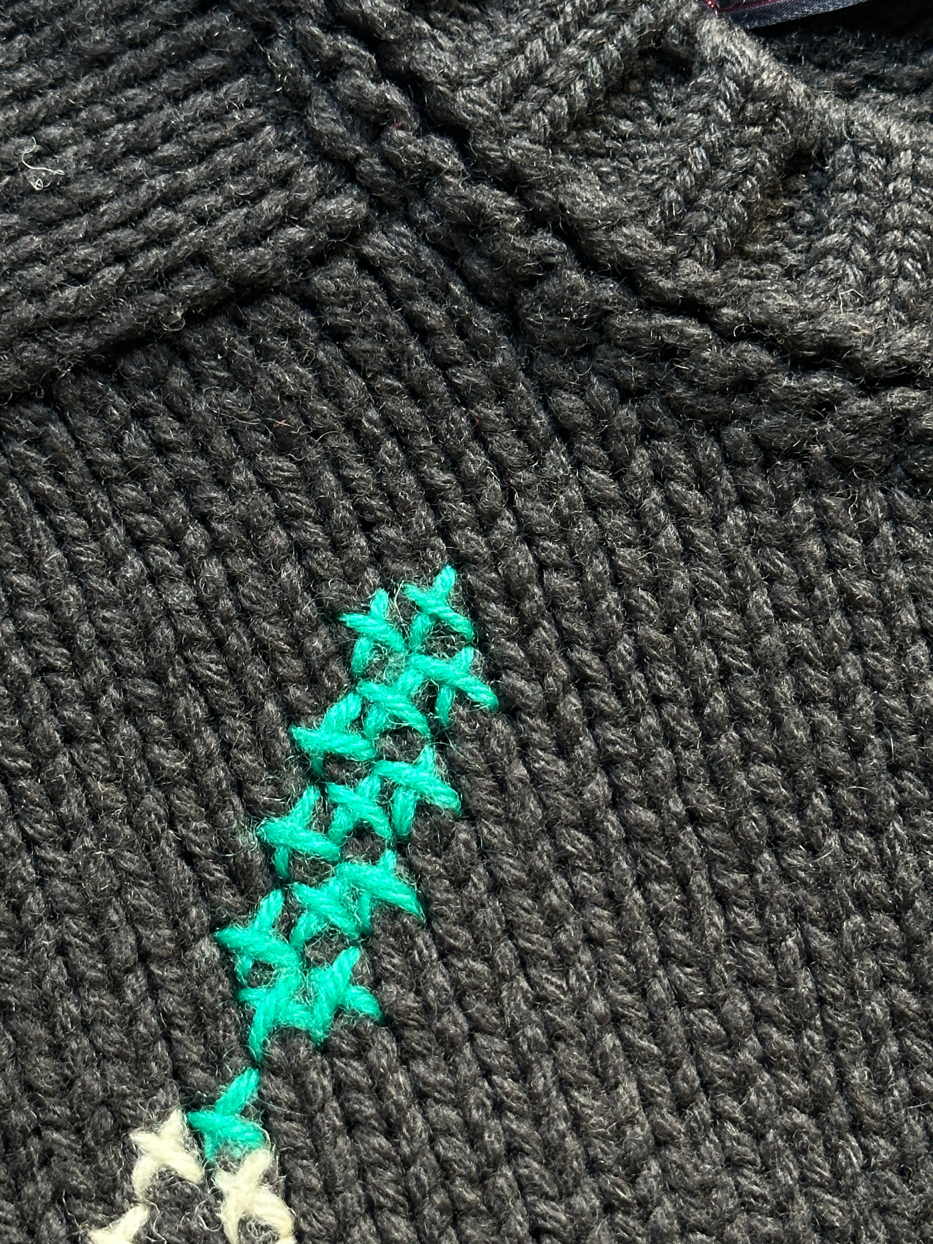 Maglione vintage stile "montanaro" di color antracite con disegni sul verde e bianco su petto e maniche con schiena tinta unita. Composizione in lana a filo spesso. Handmade in Paris, modello con scollo rotondo. Vestibilità: morbida.