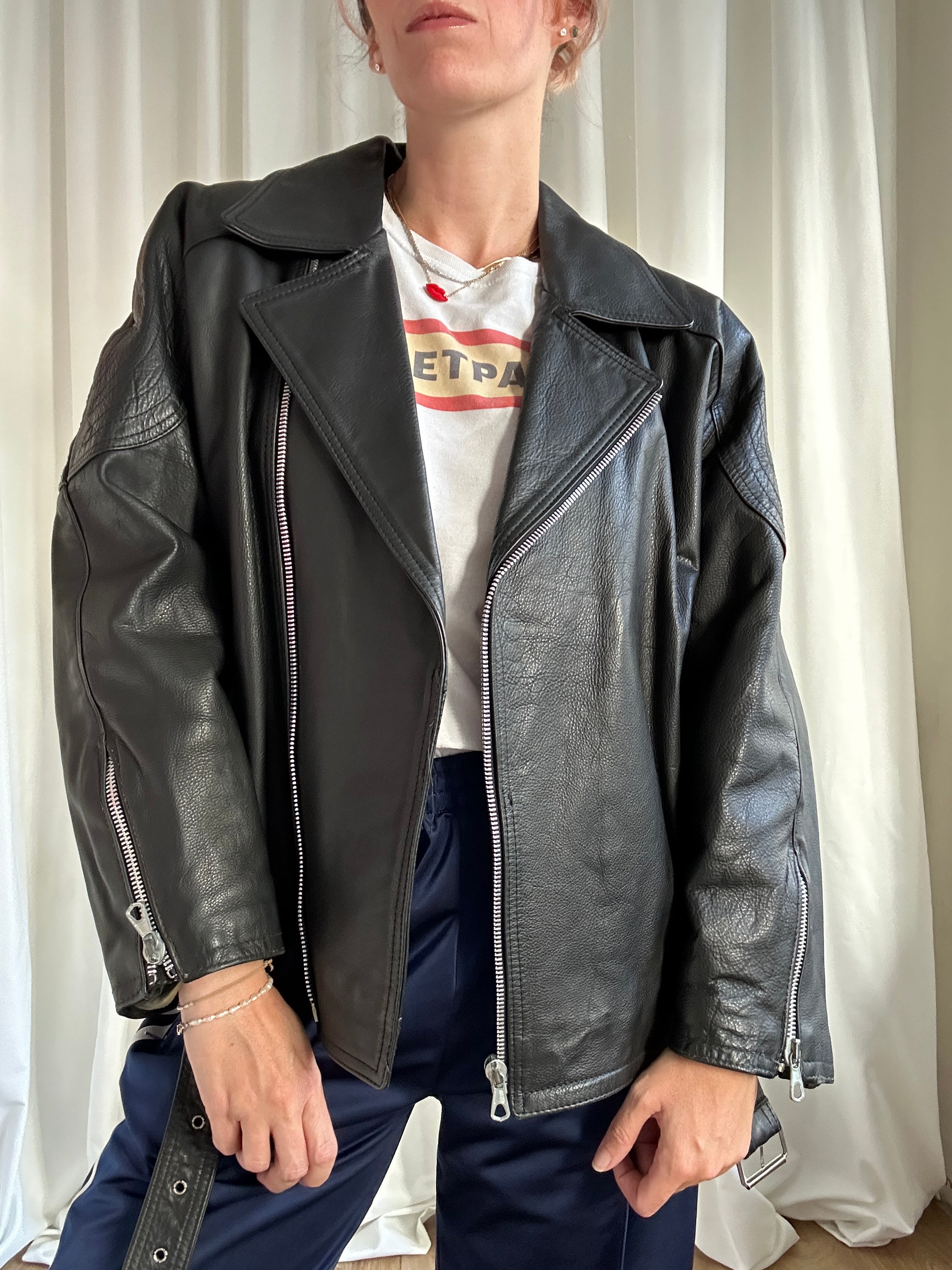 Giacca vintage modello biker in pelle. Con peso autunno-inverno anni 80, spalla raglan con cucitura centrale che va dal colletto a polsino, con zip finale. Fodera interna perfetta, giacca bella sostenuta. Stupenda anche over, chiusura con zip, peso autunno/inverno. Vestibilità dritta.