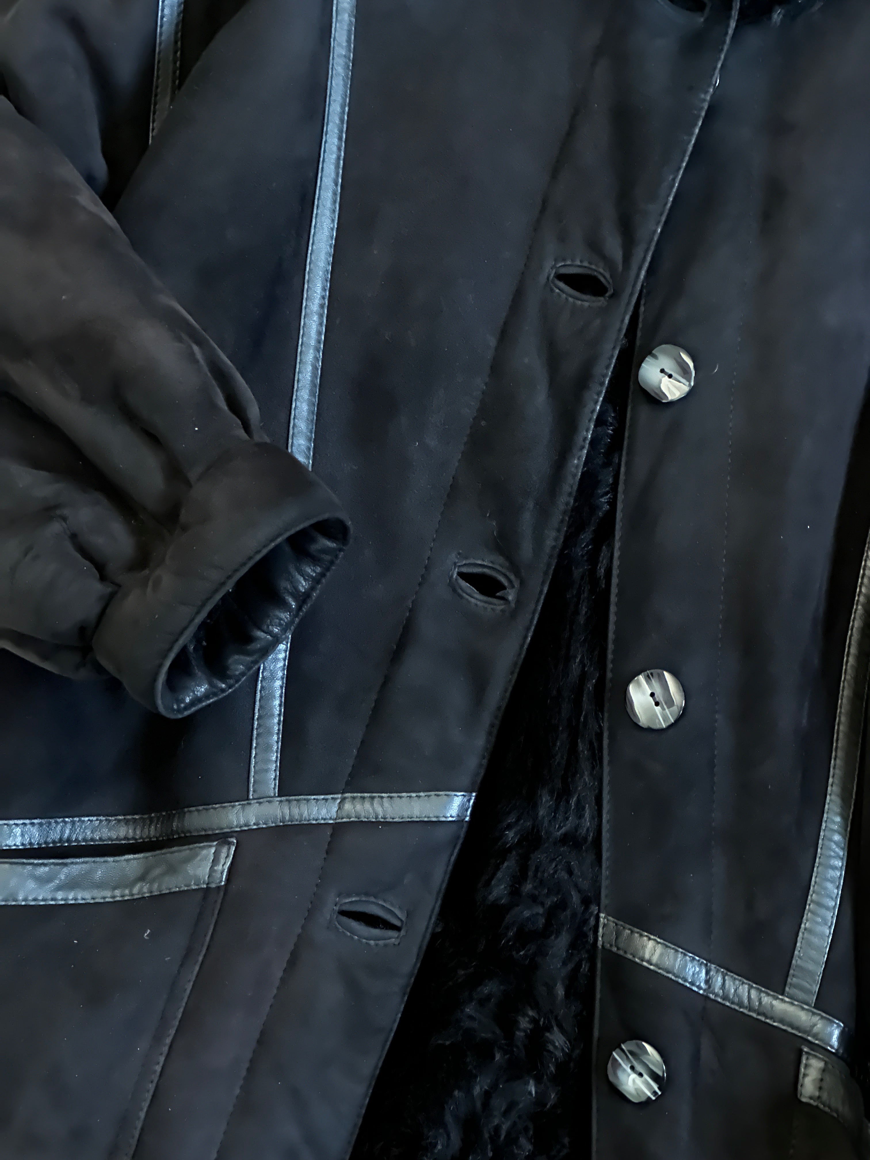 Montone Shearling nero anni 80. Caldissimo con lana lunga all'interno. Perfino le tasche e le spalline sono rivestite di lana e restano facilmente removibili. Taglio a uovo, con decori in pelle cuoio nera a contrasto con lo scamosciato. Una chicca. Vestibilità over, leggermente a stringere al fondo. Maniche a pipistrello e spalle scese.