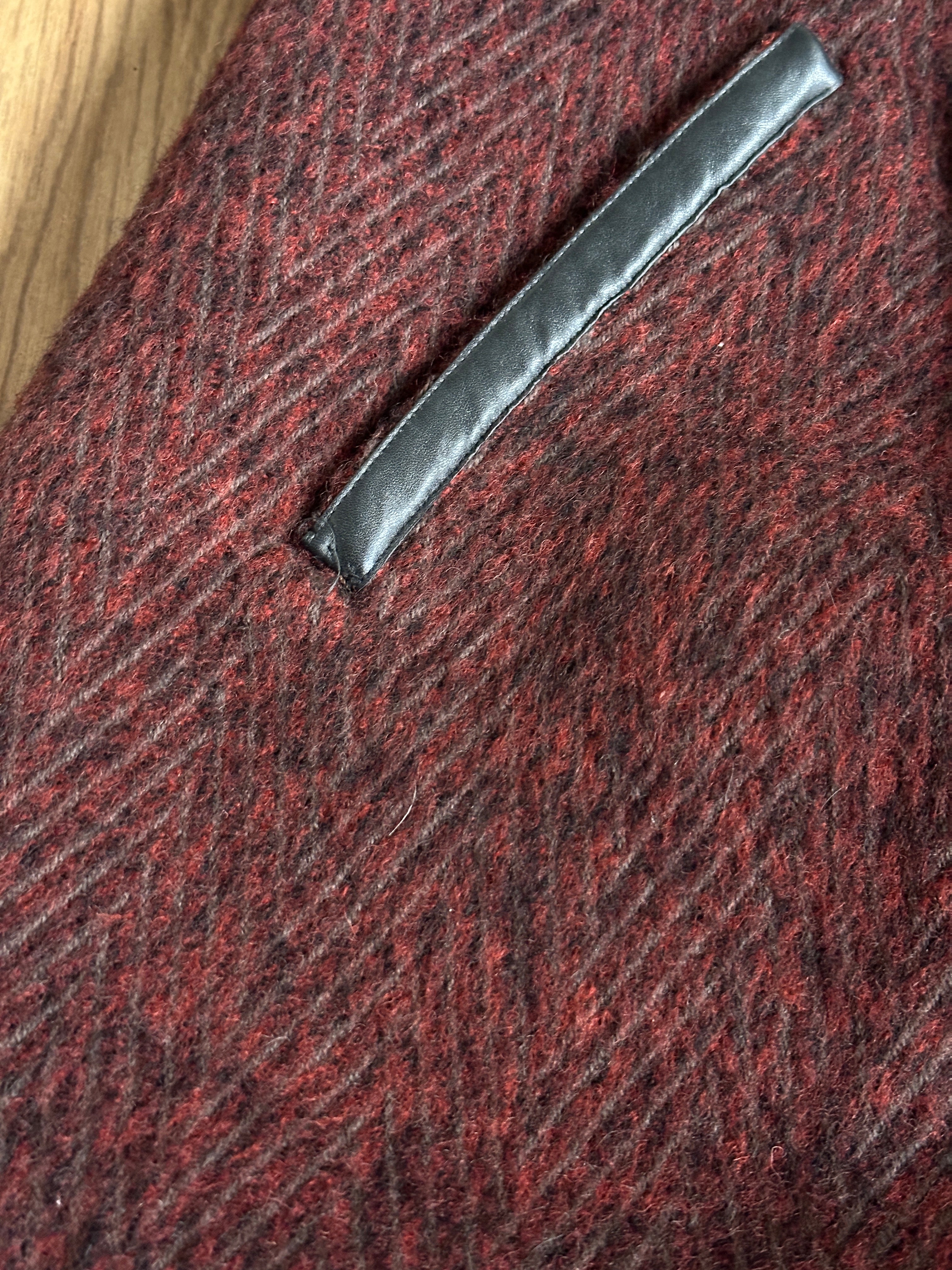Cappotto vintage sartoriale. Composizione non riportata ma certamente in lana e di alta qualità e super calda. La sua particolarità è la chiusura che anzichè avere dei bottoni ha dei laccetti in pelle con nappine finali, richiamati dal bordo delle tasche a taglio. La texture è splenidida, spigata e mèlange, sui toni del malva scuro. Il colletto ha una punta spiccata che lo rende ancora più unico e si può chiudere accollato. Non è foderato. Vestibilità ampia, morbida.