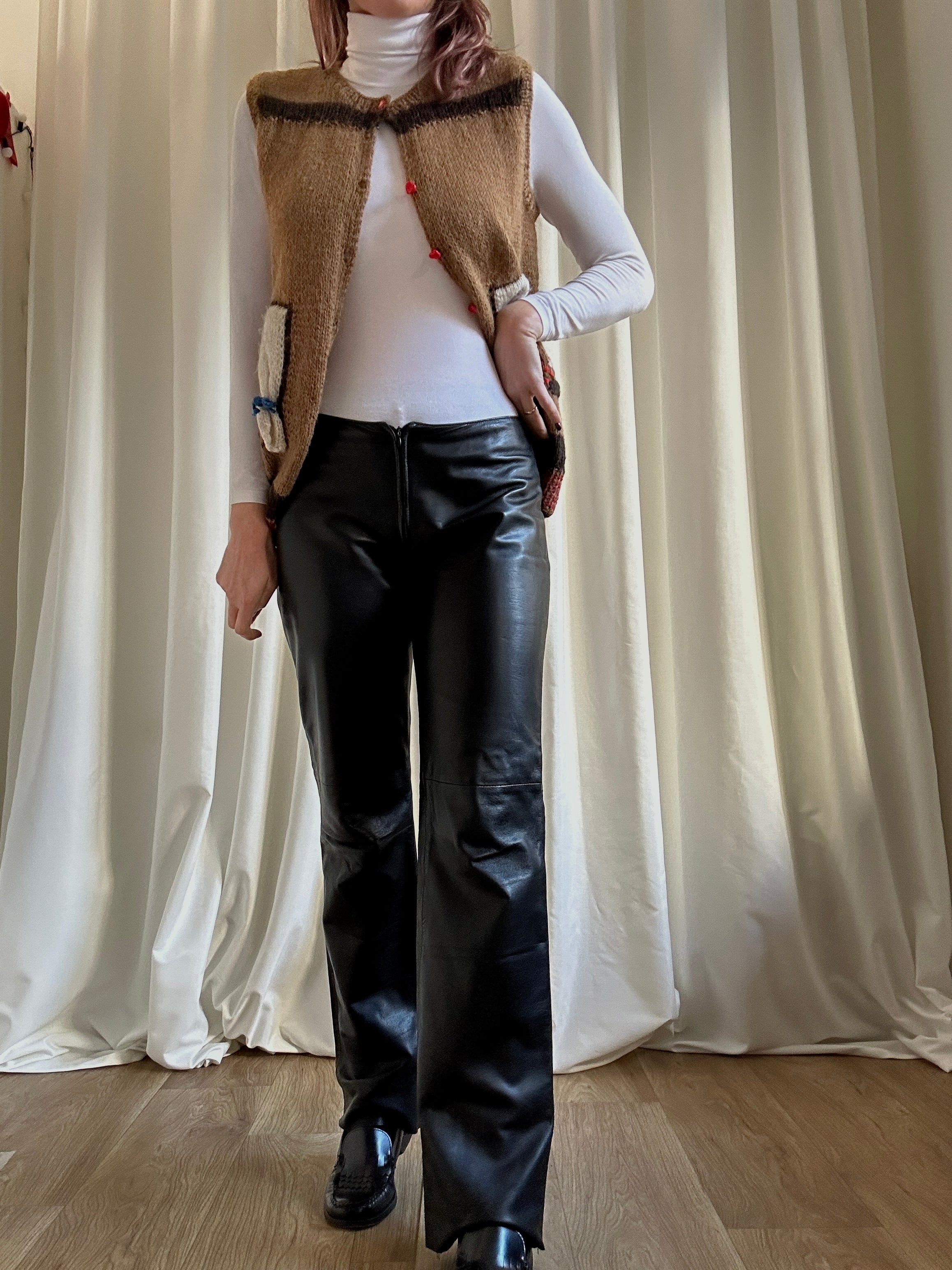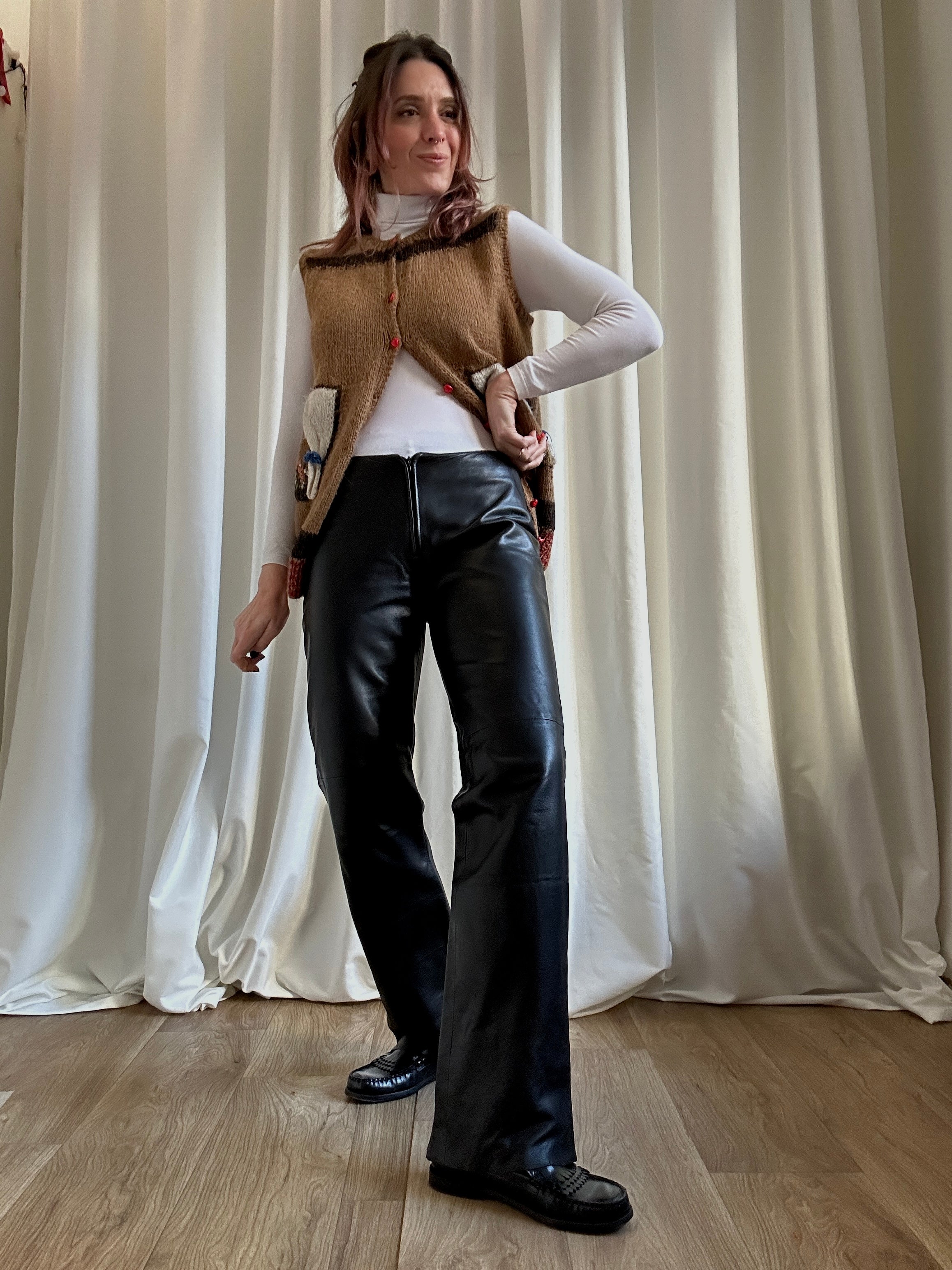 Pantalone vintage composizione 100%pelle nappa, morbida e perfetta per questa stagione. Modello con gamba dritta lievemente svasato al fondo, a vita media. Chiusura centrale con zip. Vestibilità morbida.