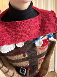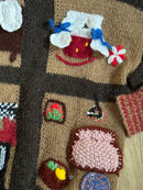 il maglioncino vintage più assurdo e stupendo che si possa avere. Ogni dettaglio è studiato per narrare una storia di vita quotidiana. Fatto a mano con dettagli in rilievo (come i cuscini del divano e il gattino sul colletto). Composizione non riportata perchè fatto a mano, sicuramente lana di qualità perchè resta bello caldo. Modello con spalla scesa e rouches, taglio abbastanza dritto, cannolè sui polsi e colletto rosso con scollo a barchetta. Vestibilità morbida.