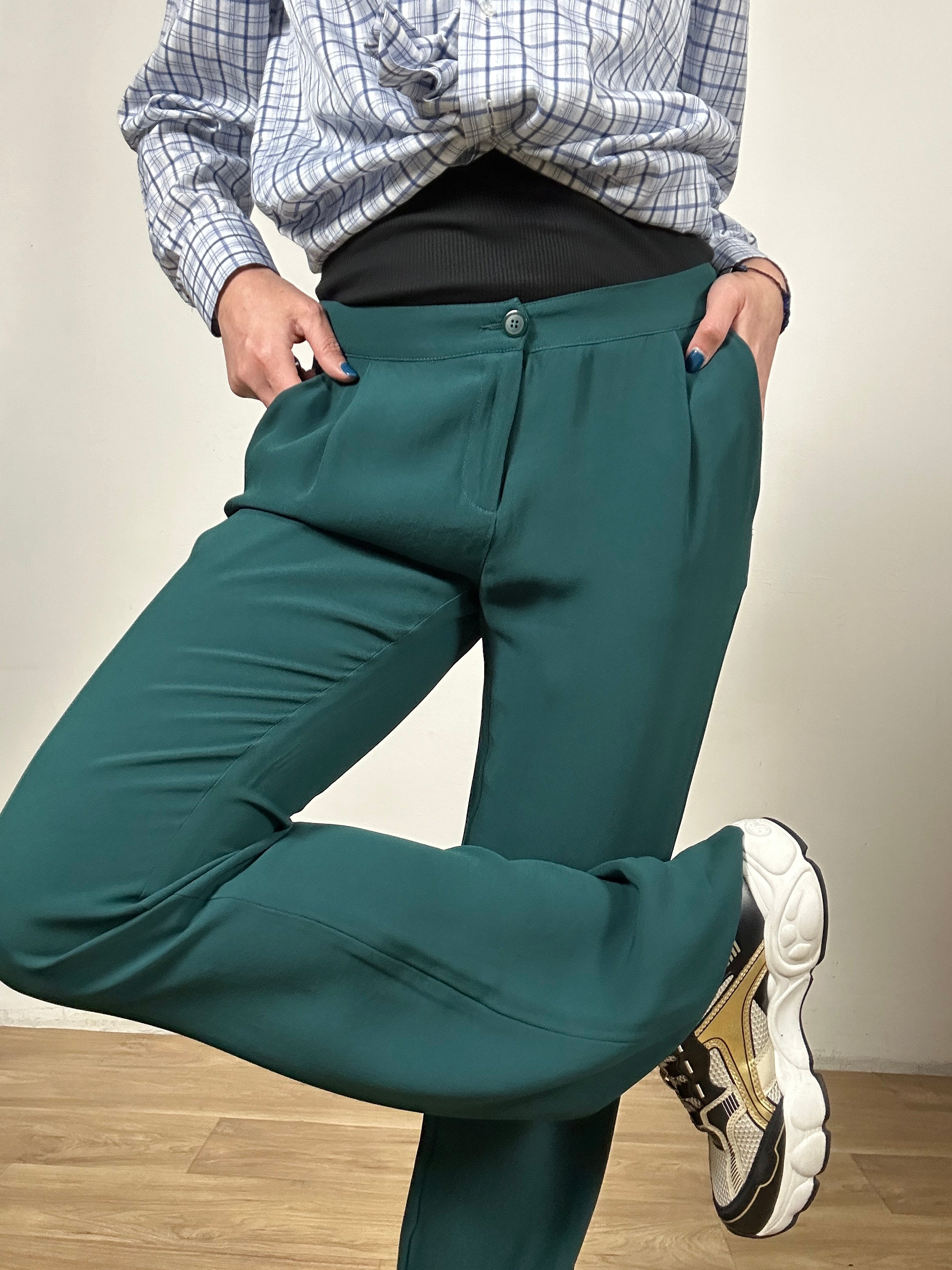 Pantalone vintage Benetton color petrolio con pinces. Nasce da donna, Composizione 86% viscosa 14% poliestere, comodissimo e leggero. Vestibilità comoda.