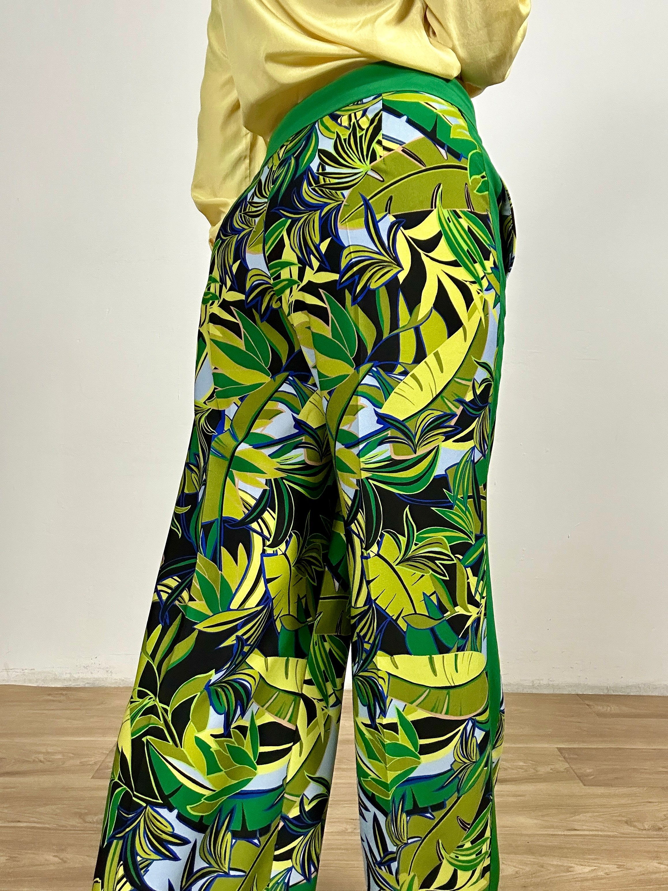 Pantalone I BLUES fantasia Jungle composizione non riportata probabilmente misto seta taglio a palazzo sui toni del verde, vestibilità comoda consiglio per taglia 46/48.