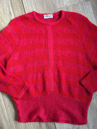 Maglioncino vintage anni 80. Composizione 40% lana 40% kid mohair 10% acrilico. Caldissimo. Modello avvitato, manica a pipistrello con cannolè alto sul fondo e sui polsi. La texture è morbida e presenta righe magenta alternate alle rosse. L'effetto resta di un chiaro-scuro molto particolare. Vestibilità avvitata, ampia sulle maniche.
