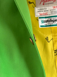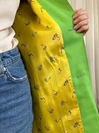 Trench vintage anni 70 con cartellino. Alta sartoria, di colore verde mela, peso medio con protezione scotchgard. La fodera interna con disegni adorabili è a contrasto. I bottoni sono oro con chiusura a scelta: sia a destra che sinistra grazie al doppio bottone e alla doppia asola. Accessori inclusi, cintura con passanti da cucire (perché è di alta sartoria e si poteva decidere se aggiungerli o meno) e cappellino con fodera coordinata. Vestibilità: dritta