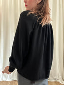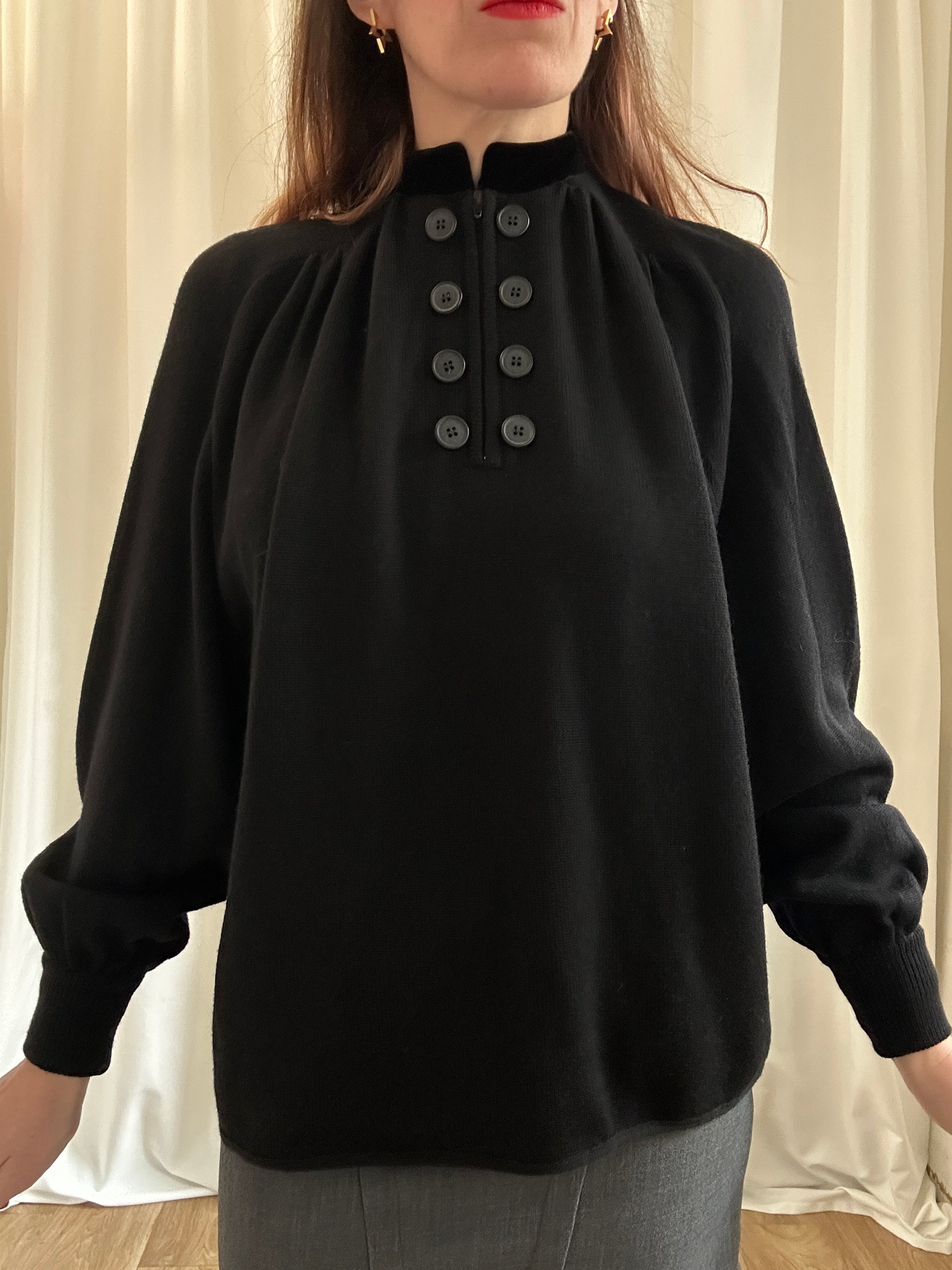 Maglia by Valentino Studio anni 80. Modello accollato con un colletto in velluto nero e doppia abbottonatura a decoro con chiusura a cerniera sul davanti. manica raglan che stringe sul polsino facendo blindare la manica. Elegantissima. Vestibilità morbida, taglio dritto. Composizione 100% lana.