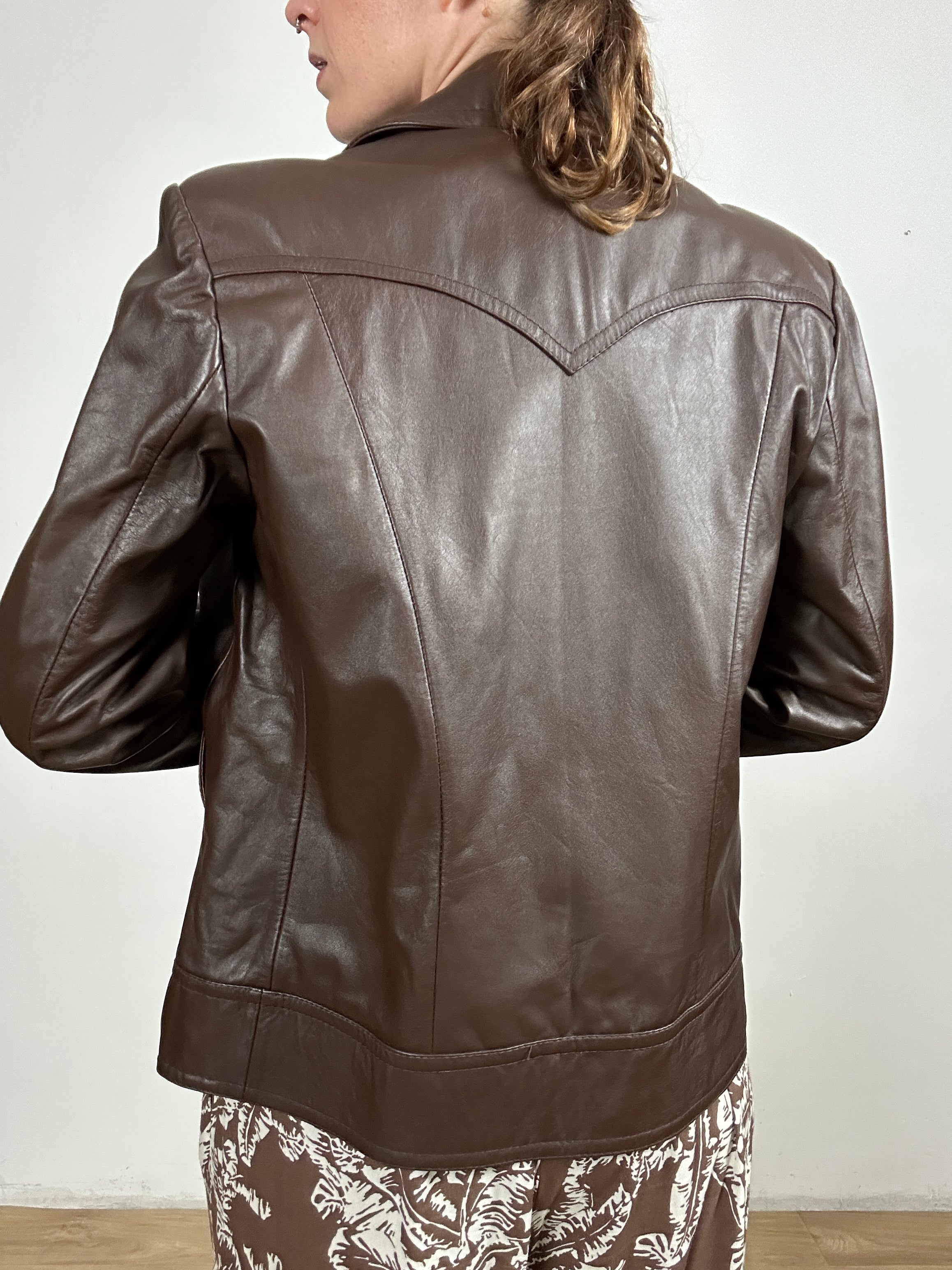 Giacca in pelle vintage anni 70 cucita a mano, chiusura doppiopetto color cioccolato nasce da uomo ma è perfetta unisex, due taschini sul davanti con chiusura bottone lunghezza sui fianchi vestibilità dritta.