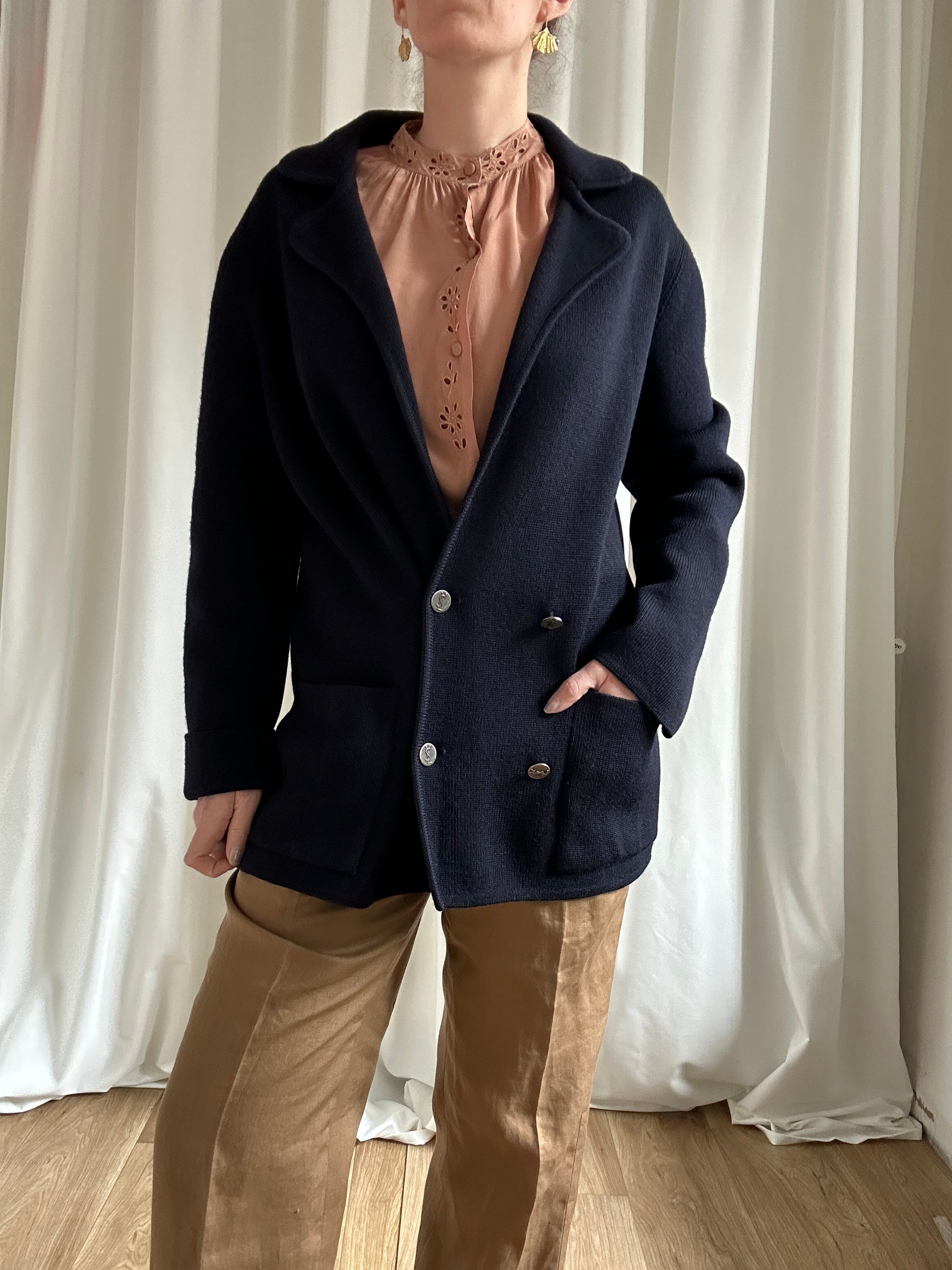 Blazer vintage Yves Saint Laurent, stile cardigan blue, composizione 100% lana, con colletto con rever classico, arrotondato, chiusura doppia con quattro bottoni loggati, due taschini sul davanti, sfoderato. Nasce in sartoria come modello da uomo, perfetto unisex, con vestibilità morbida.